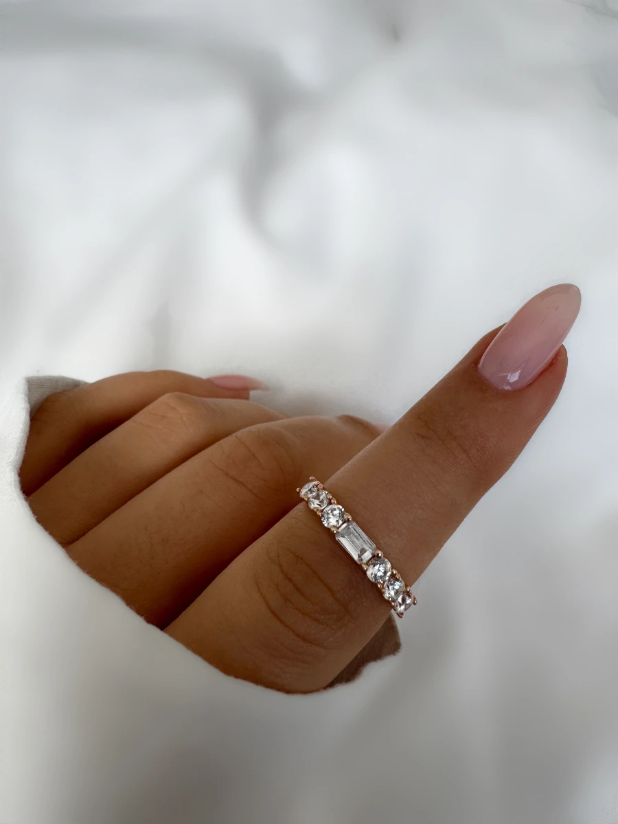 טבעת דגם פיור, טבעת פס משובצת אבני זרקון ובמרכז אבן בחיתוך בגט.